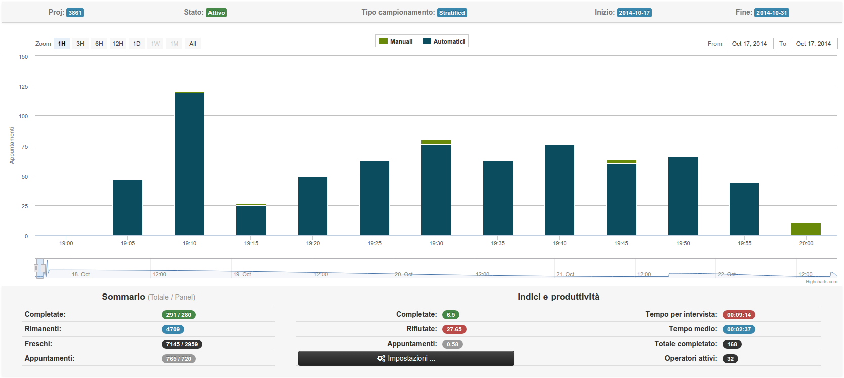 Una volta collegati al progetto, si può vedere un riassunto dell'andamento dell'indagine (in forma di grafico) ed una serie di informazioni utili per la gestione dell'indagine: nella parte alta delle informazioni riguardanti la configurazione del progetto, come l'identificativo, la tipologia di campionamento e l'inizio / fine del progetto, mentre nella parte bassa un riassunto in forma di numerosità delle interviste o contatti, oppure di indici di produttività che descrivono l'andamento dell'indagine. Cliccando sul pulsante Impostazioni (nella sezione in basso), si può selezionare l'intervallo in cui calcolare gli indici di produttività, mentre la visuale del grafico può essere cambiata usando la navigazione sottostante al grafico, oppure i bottoncini e le caselle di testo in alto. Se, invece, si desidera visualizzare o nascondere una delle serie del grafico, basta cliccare sul nome della serie nella legenda in alto.